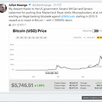 호주출신의 저널리스트인 줄리엔 어산지는 내부고발자 사이트인 위키리크스(https://wikileaks.org)를 만들어, 전세계 정부와 거대기업드의 비리를 밝혀내는 사이트를 운영하고 있습니다. 그러다 보니, 여러곳에서의 압력을 받아올 수 밖에 없었겠죠. 이러한 압력중에는 글로벌신용카드회사인 Visa, MasterCard, Amex, Moneybookers와 Paypal을 통해서 후원을 받는것을 받을 수 없도록 압력을 행사했던 모양 입니다. 그래서 위키리크스는 2010년 부터 비트코인에 타의로 투자를 하게 되었는데, 그때부터 받은 비트코인이 지금 50,000%의 수익이 되었다고 트윗을 했습니다. 500배의 수익인 셈입니다. 그런데, 그렇게 조치를 취한이들이 미국정부와 맥케인 미국상원의원, 리버맨 미국상원위..