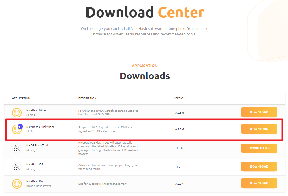 다운로드 센터를 들어가서 보면, Nicehash Miner가 제일 위에 있구요. NiceHash Quickminer가 바로 밑에 있습니다.