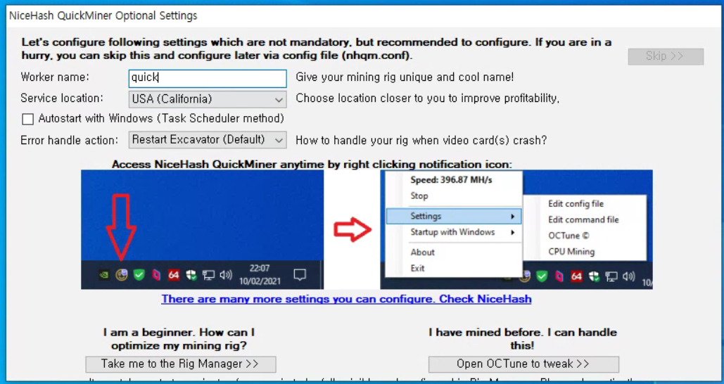 QuickMIner세팅 화면이 표시 되었습니다.