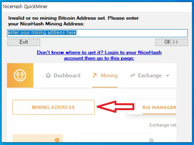 Nicehash에 가입할 때, 부여된 비트코인 주소를 입력 합니다.