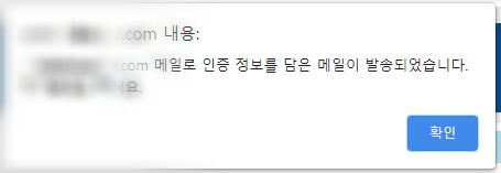 입력한 이메일로, 인증정보가 발송되었다는 알림 메시지가 표시 됩니다.