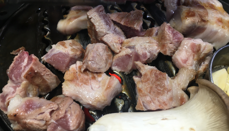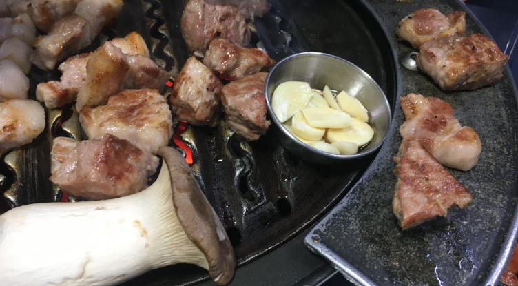 고기가 나오는데는 시간이 조금 거렸어요. 고기판에 익은 고기 올려 놓는 판이 있는 것도 독특 합니다. 목살과 삼겹살과 버섯이 올라가고, 참기장+마늘이 준비 되었습니다. 땅코숯불구이는 기본적으로 고기를 직접 구워 주십니다. 그래서 타지 않은 고기를 육즙을 머금은채로 먹을 수 있어요. 소고기도 아니고, 돼지고기를 이렇게 구워주는 곳은 처음본것 같아요. 그래서 그런지, 고기가 더 맛이 있었어요.