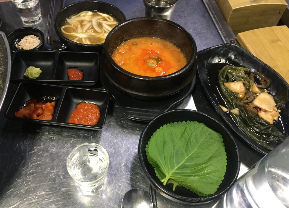 들어가서 보니, 대표메뉴가 목살, 삼겹살, 갈매기살 이었습니다. 3명이면, 어떻게 주문하면 좋겠냐 문의 했더니, 목살2인분에 삼겹살1인분으로 추천을 해주셨어요. 물론, 궁금해서 나중에 갈매기살도 추가 주문을 했습니다. 주문을 하고 주변을 둘러보니, 테이블당 이용시간이 2시간으로 한정이 되어 있더군요. 당시에는 모르고 먹었는데, 손님들이 계속 들어오니, 오래 못앉아 있겠더라구요. 어찌 되었던, 그건 나중 이야기 이구요. 주문을 하고나니 바로 반찬 세팅을 해 주셨습니다. 명이나물, 양파양념, 소금, 고추냉이, 된장, 된장찌게, 깻잎등이 나왔구요. 핫.. 사진에 소주가 등장 했네요.