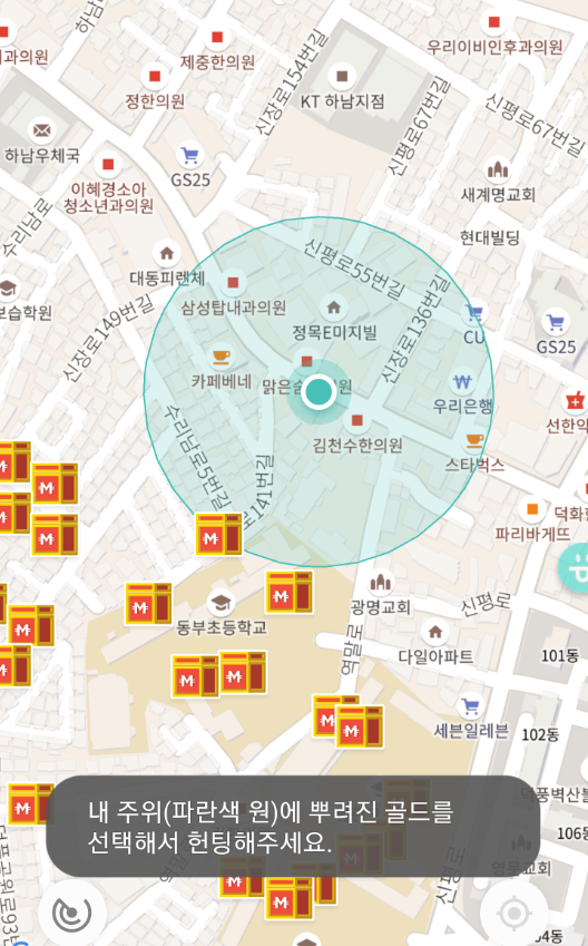그런데, 아래와 하면과 같이 영역을 벗어난 곳을 클릭 하면, "내 주위(파란색원)에 뿌려진 골드를 선택해서 헌팅해 주세요"라는 메시지가 표시 됩니다.