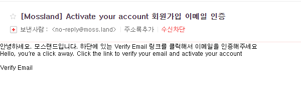 게다가 Verify Email이라고 써 있는 링크를 클릭해야 하는데요. 검정색이라 링크가로 인식이 되지 않아 처음 사용자들이 헷갈려 합니다.