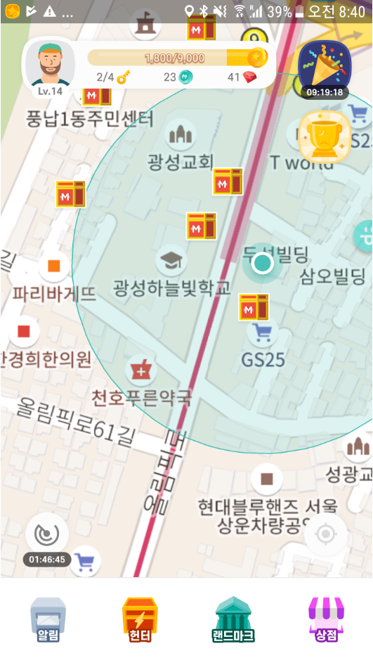 모스랜드는 포켓몬고의 증강현실(AR)을 모티브로 가져와 게임화 하여, 코인과 접목을 시켜 투자자들의 시선을 끌었던 코인 입니다. 백서에 따르면, 가상현실의 부동산 자산을 경매 형태로 사고 파는 것을 목표로 하고 있으나, 현재까지는 보물찾기로, 골드를 모으고, 골드를 모스코인으로 환전하고, 모스코인으로 해피머니온라인상품권을 교환하여 현금화 할 수 있는 상태 입니다. 건물같은거 없이, 순전히 보물찾기만으로 일주일에 4천원 정도의 해피머니온라인상품권을 획득할수 있습니다. 단, 매일 아침저녁으로 포켓몬고에서 포켓몬 찾듯이, 보물상자를 찾는 수고를 하루에 30분 정도 해야 합니다. 자 그럼, 보물찾기를 시작해 보겠습니다.