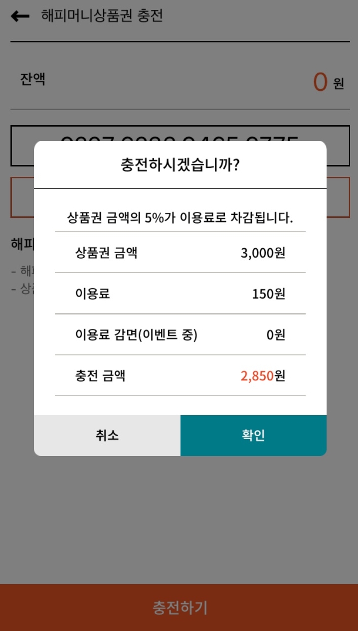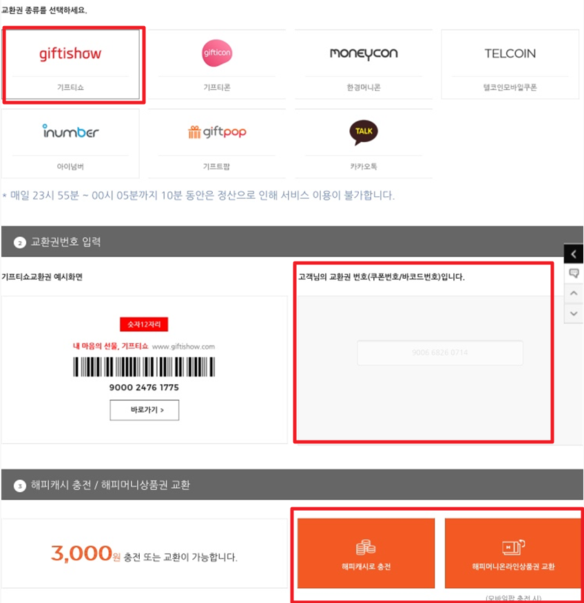 그렇게 입력을 하고나면, 3,000원 충전 또는 교환이 가능하다는 메시지와 함께