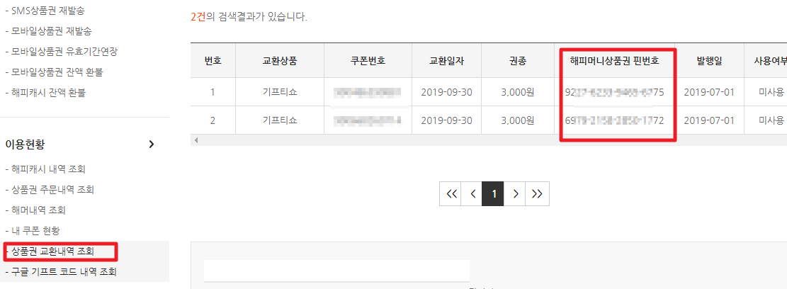 아래 화면을 보시면, 해피머니상품권 사이트로 가서, 상품권 교환내역조회를 해보면, 해피머니상품권 핀번호를 볼 수 있습니다.