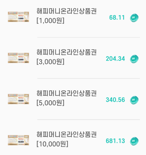 - 상점에서 해피머니온라인상품원 1,000원은 73.43 모스 이므로, 960원 정도라고 할 수 있습니다.