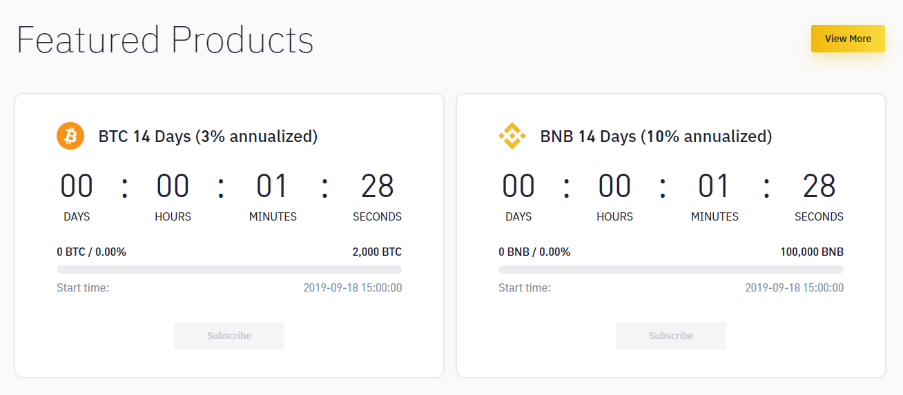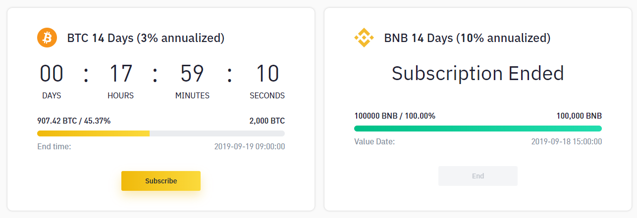 위 화면을 보시면, BTC 14 Days(3% annualized) 라는 내역과, BNB 14 Days (10% annualized)라는 내역이 동시에 표시 됩니다. 그 아래에는 얼마후에 해당 상품이 개시되는지 남은 시간을 보여 줍니다. 위 화면에서 보여지는 상품들은 1분28초 후에 상품이 열린다는 뜻이 되겠죠. (사실 저도 이 상품에 참여하기 위해, 2분 전에 알람을 맞추어 놓았습니다) 곧, 시간이 00:00:00:00이 되면, 버튼이 활성화 됩니다.