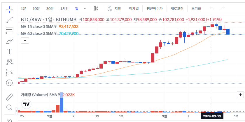 그런데, 불현 듯 연초에 비트코인 ETF상장이 SEC로 부터 승인 나면서 부터, 이제 본격적으로 오프라인 금융자금이 코인시장에 들어오면서 다시 한번 홍역을 치루겠구나 싶더라구요. 그러더니, 불과 몇일전에 빗썸시세로 비트코인이 1억을 넘는 기록을 세우게 되었습니다. 정확히는 3월11일 부터 ~ 3월15일 까지 5일에 걸쳐서 1억 언저리에서 포인트를 찍은 후 현재는 살짝 내려오면서 숨 고르기를 하고 있습니다.