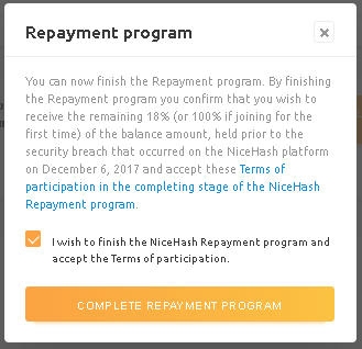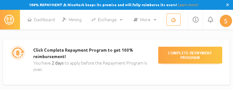 아래 보시는 화면은 NiceHash에서 100%상환해주는 날짜가 2일 남았다는 공지 입니다. 사실 안받아도 상관이 없는 금액이기는 합니다. 사실 꽤 오래전 부터 나머지 잔액에 대해, 그냥 기부하는 방안도 있었어요. 하지만, 이날을 기념하기 위해 계속해서 남겨 두었습니다. 드디어 감격스러운 그날이 왔습니다.
