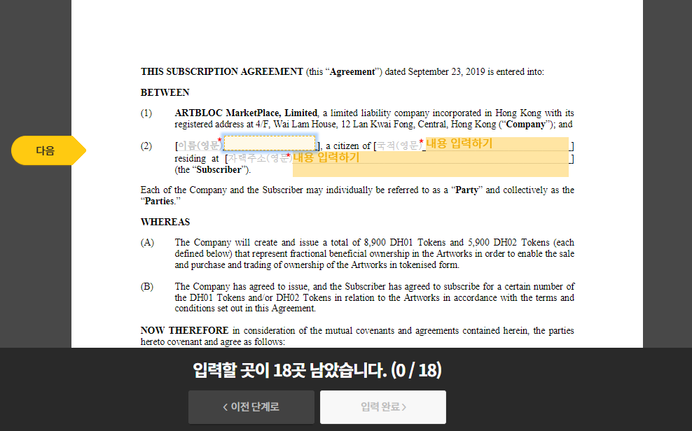모든 것을 입력하고, 서명을 하거나, 도장이미지를 올리는 서명중에서 선택하도록 되어 있습니다.
