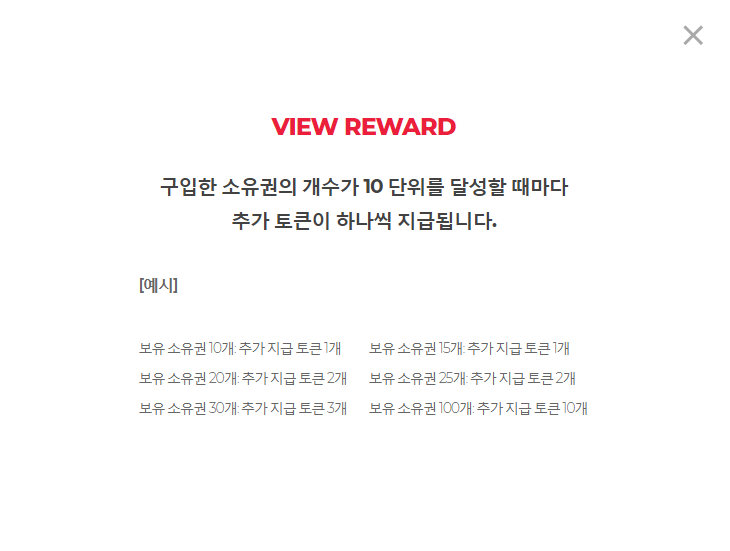 VIEW REWARD버튼을 클릭 하면, 아래 화면이 표시되는데, 지분 구입시 소유권 10개를 구입할 때 마다, 보너스로 추가 지분을 준다는 의미 입니다.