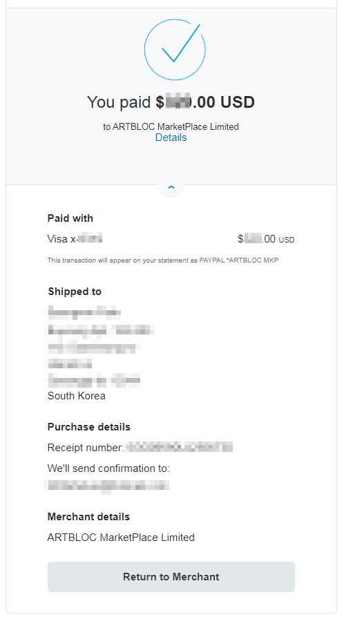 아래화면은 구입을 하기위해 작품에 대한 설명이 표시된 화면 입니다. 8,900개의 지분으로 쪼개어 판매를 하고, 지분의 개당 가격은 $8 입니다. 작품의 가격을 $71,200로 책정한 셈이죠. 한화로 약 8,000만원 정도로 계산을 하고 있네요. 향후에 이 작품의 가격이 상승하기를 바라며, 구매를 해봅니다.
