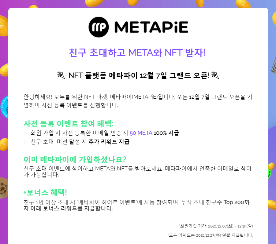 이번 이벤트는 올7월에 베타오픈했던 METAPie를 12월7일에 그랜드 오픈하면서 회원을 유치하기 위한 이벤트 입니다. 그래서, 친구를 가입시키는 이벤트를 하는 것입니다. 여러분들도, 이 링크를 통해 가입 하시고, 친구분들을 많이 초대 하셔서, 보너스 META를 받으시길 바랍니다.
