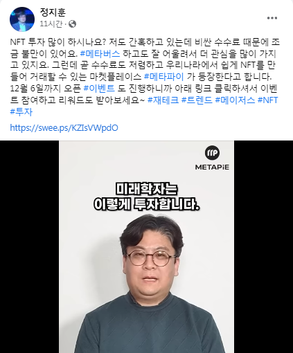 2021년 메타버스와 NFT의 해라고 해도 과언이 아니라고 할텐데, 지금의 이런 분위기라면, 2022년이야 말고, NFT와 메타버스의 전성기가 되지 않을까 하는 기대감이 있습니다. 글로벌 기업 facebook의 회사명의 META변경이라든가, NFT시장규모가 20조원에 이른다는 소식을 접하면, 뭔일이 벌어질것만 같은 분위기 입니다. 게다가 최근에는 Upbit에서도 NFT서비스를 한다고 하고, 이미 Bianance에서는 NFT를 서비스하기 시작 했는데, 아직 대중화가 되기에는 많은 시간이 필요할 것 같고, 얼리업댑터나 IT신기술을 즐기는 층에서 이런저건 테스트를 해보시는 시기가 될거라는 생각이 듭니다. 이런 와중에, Facebook 타임라인을 스크롤 하는데, 갑자기 정지훈 박사님이 영상으로 등장하여 MetaPie 이벤트를 소개해 주시더군요.