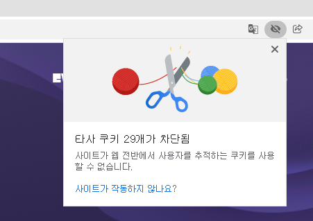 아이콘을 클릭하면, 타사 쿠키가 차단되어 있다고 나옵니다.