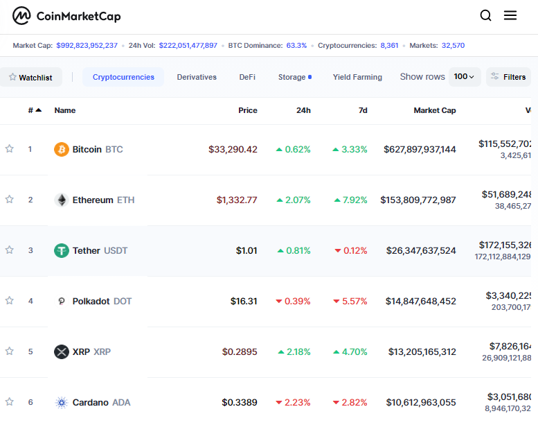 coinmarketcap.com으로 이동을 하면, 아래와 같은 화면을 보게 됩니다. 전 세계 코인 8,361개의 코인과 32,570개의 코인 거래장터의 정보가 수시로 업데이트되는 곳입니다. 코인의 순위는 Marketcap(마켓캡) 즉 시가총액을 기준으로 순위가 매겨집니다. 현재는 비트코인, 이더리움, 테더(달러화 연동 스테이블코인), 폴카닷, 리플, 카르다노 순입니다. 대부분 몇 년 전에 만들어진 코들이 이지만, 이중에서는 폴카닷은 2020년에 만들어진 핫한 코인입니다. 이렇게 주욱 훑어보거나, 찾고자 하는 코인의 이름을 검색합니다.