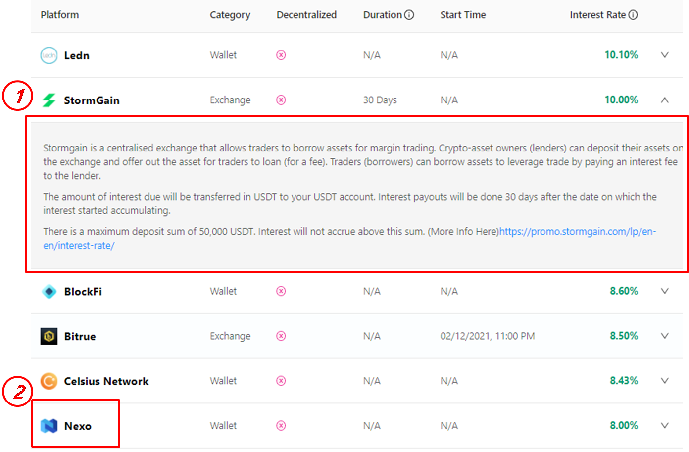 ⑦ Duration은 암호화폐를 빌려주는 기간을 표시하는 것인데요, 각 서비스별로 기간이 다른것을 표시하는 것이죠.