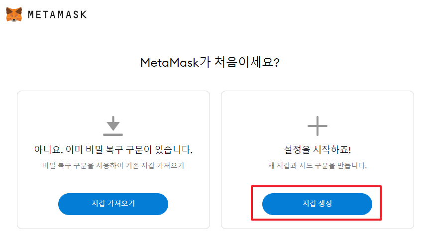 우리는 처음 사용자임을 전제로 우측에 있는 지갑 생성 버튼을 클릭합니다.
