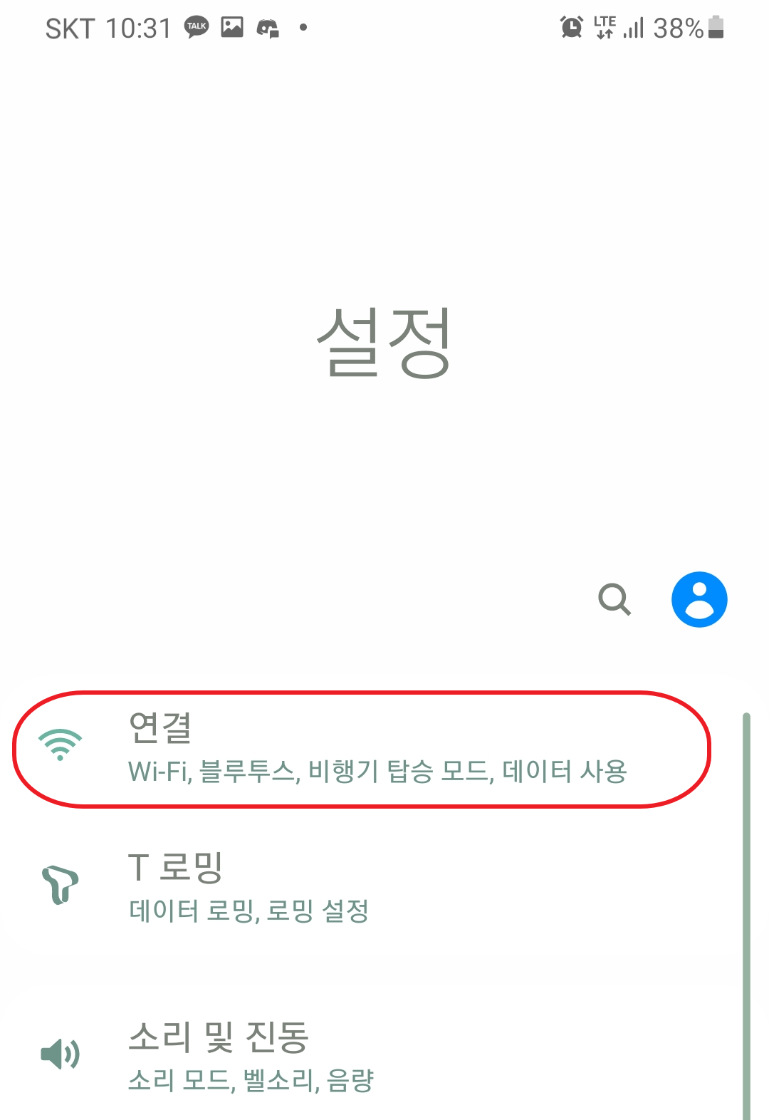 설정 화면에서는 통신연결을 담당하는 [연결]을 찾아서 실행 합니다.