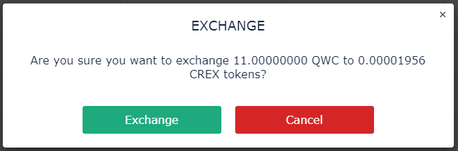 이 코인들 중에서 QWC의 Burn 버튼을 클릭해 보았습니다. 아래와 같이 QWC를 CREX token으로 전환해준다고 합니다. Exchange 버튼을 클릭합니다.