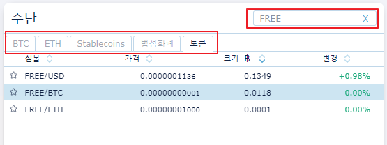활용팁 두번째, Faucet을 통해서 받는 코인들을 무조건 BTC로만 팔 수 있는건 아닙니다. 코인에 따라서 상장되어 있는 시장이 다르므로, 코인별로 거래되는 시장을 확인하고 파시면 됩니다. 예를 들어 아래 화면의 FREE코인의 경우 Crex거래소 우측에 Free라는 코인명을 입려하면, 거래가 가능한 시장이 표시 됩니다. FREE같은 경우에는 토큰 중에서 USD, BTC, ETH로 거래가 가능 합니다. 코인에 따라서는 법정화폐중에서 거래가 가능한 경우도 있고, ETH로 거래 가능한 경우도 있으니, 잘 확인하시기 바랍니다.