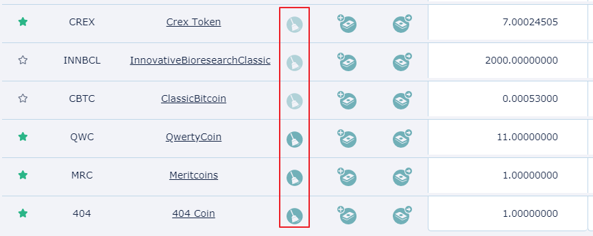 아래 화면은 Crext24의 Account 화면입니다. 화면의 중앙에 빨간색 상자로 표시한 부분이 Burn 버튼 입니다. 버튼 중에서 흐린 버튼은 비활성화된 버튼 입니다. 이 코인들은 Burn이 되지 않습니다. 지금 제가 보유하고 있는 코인들 중에서 3가지만 Burn이 가능 합니다. QWC, MRC, 404 입니다.