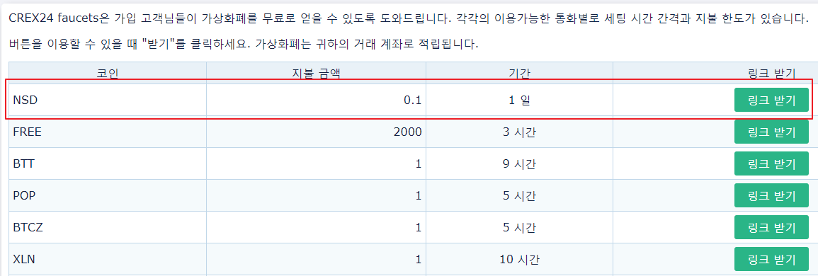 Faucet 활용팁 세번째는 가끔씩 알짜 코인을 주기도 한다는 것입니다(활용법은 아닌것 같은데...) 그 시기가 언제가 될지는 알 수 없지만, Faucet으로 몇일을 모아도 얼마 안되는데, 이런 코인 덕분에 잔고가 쑥쑥 성장하는 것이죠. 이번에 받은 코인은 NSD코인인데, 받자 마자 BTC로 바꾸었습니다. 아래 화면은 NSD코인이 Faucet에 등장한 화면 입니다.