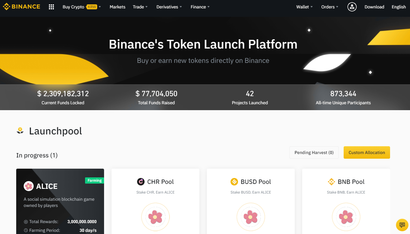 LaunchPool : 바이낸스 토큰 상장 플랫폼 - ALICE 파밍 (Farmining : 농사 짓기) 하기 본문