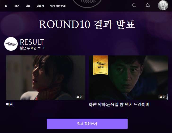 다시 메인화면의 상단 메뉴를 보면, PICK이라는 메뉴가 있습니다. 이 서비스는 두편의 영화 중에서 내가 투표한 영화가 PICK에 선정이 되면, 보상을 받는 서비스 입니다. 투표권을 받으려면, 유료영화를 관람하거나, 20,000 MBL을 보유하고 있어야 합니다.