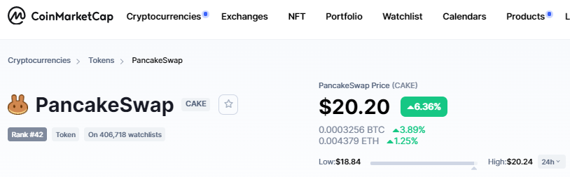 아래 있는 캡쳐 화면인 코인마켓캡에서의 시세를 살펴 보면, PancakeSwap (CAKE)의 가겨이 20임이 확인 되죠?