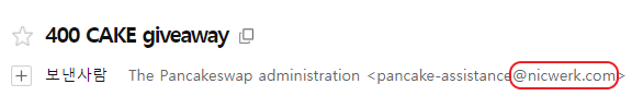 이제, 받은 메일을 살펴봅니다. 보낸 메일이 PancakeSwap과는 관련이 없는 메일 도메인 입니다.