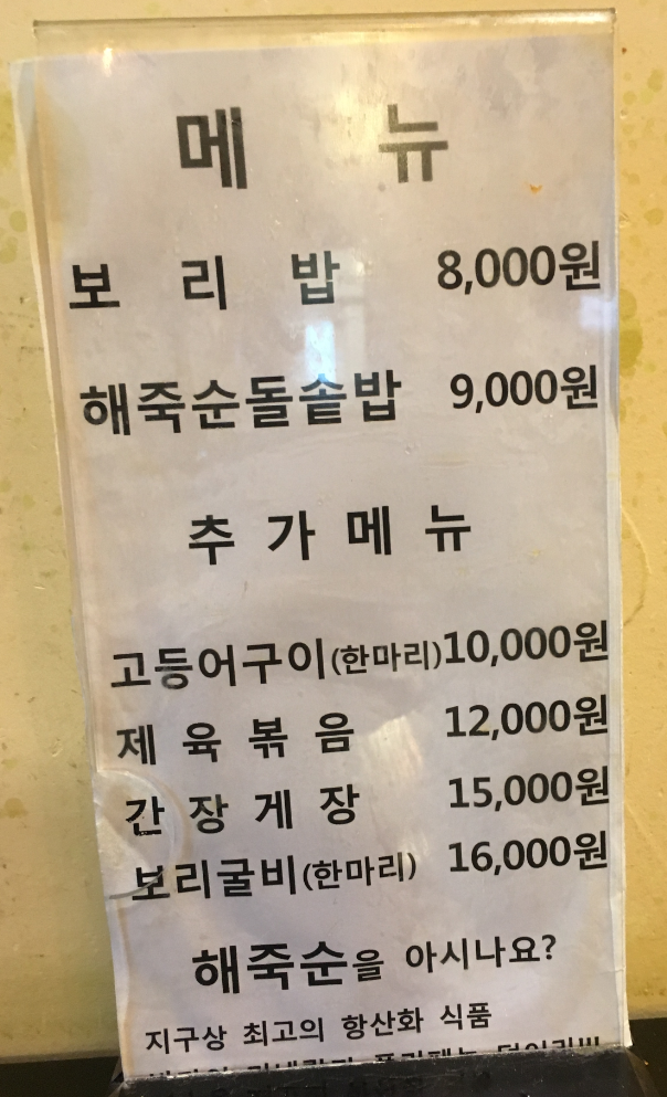 메뉴로는 보리밥과 해죽순돌솥밥이 있었고, 추가메뉴로 메인요리(?)를 주문하는 방식입니다. 따라서, 2인~3인 이상이 와서 식사를 해야 하는 것이죠. 그런데, 혼자가도 식사는 할 수 있습니다. 대신 1인인 경우 상차림비 천원을 더 받았습니다.