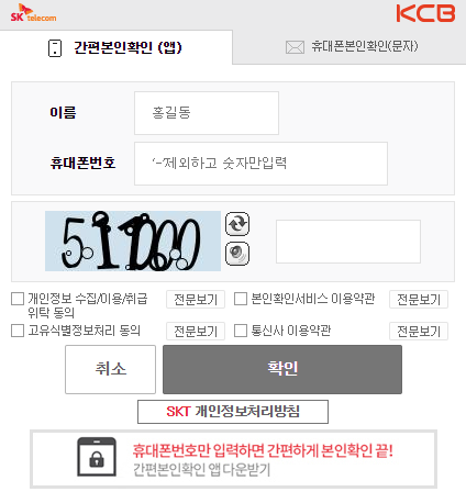 간편본인확인(앱)으로 인증을 하거나, 휴대폰본인확인(문자)를 통해서