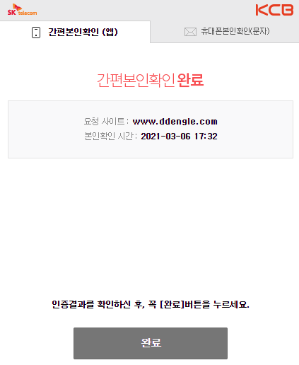 본인 인증이 완료되었다는 메시지가 표시 되면서
