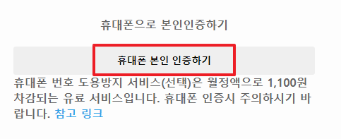 중간에 휴대폰 본인 인증하기 버튼을 클릭해야 합니다.