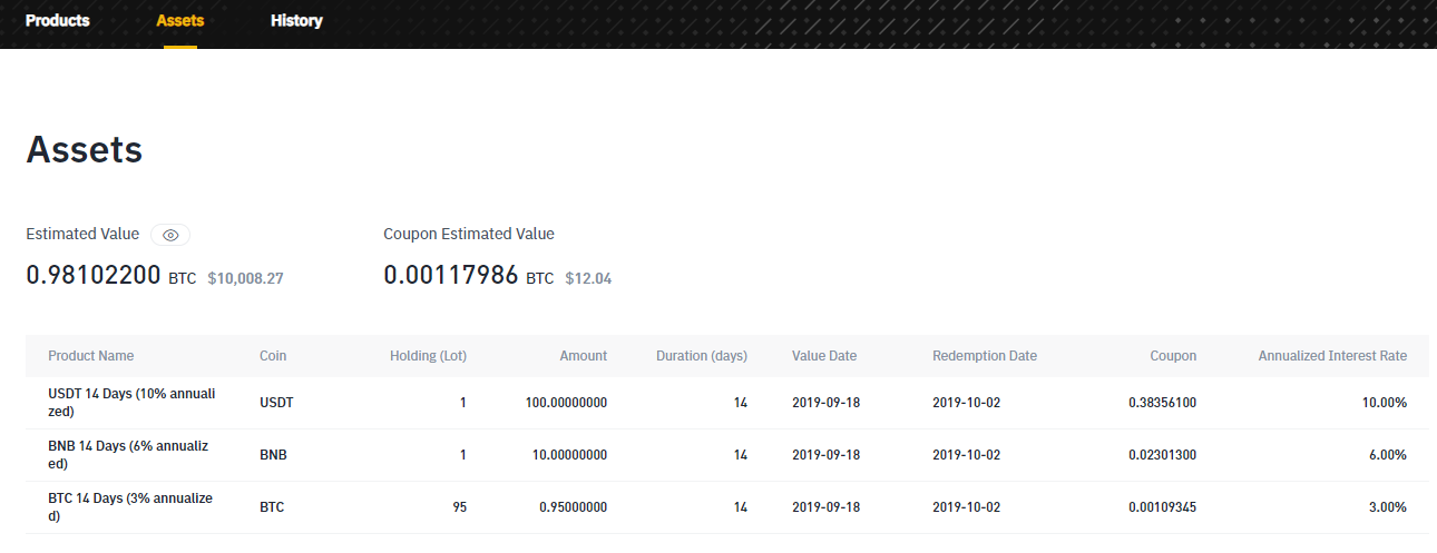 이 Lending 상품은 수시로 예고를 하고, 예고한 시간에만 상품에 투자할 수 있습니다. 조금이지만, 안정된 수익을 위해 조금의 부지런함이 필요합니다. 이번에 정리한 BTC, BNB, USDT에 대한 대여는 일주질 정도 전에 진행했던 내역이구요. 9월22일 현재 상펴 보니, 아래와 같은 화면이 보였습니다.