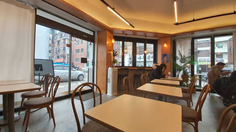 실내에 들어와서, 입구쪽을 보면, 아래 사진과 같은 모습 입니다. 2인테이블로 구성되어 있으며, 창을 바라보는 테이블도 있습니다. 예상 하시겠지만, 코로나 시국에도 점심시간에는 줄을 서야 먹을 수 있는 곳 입니다.