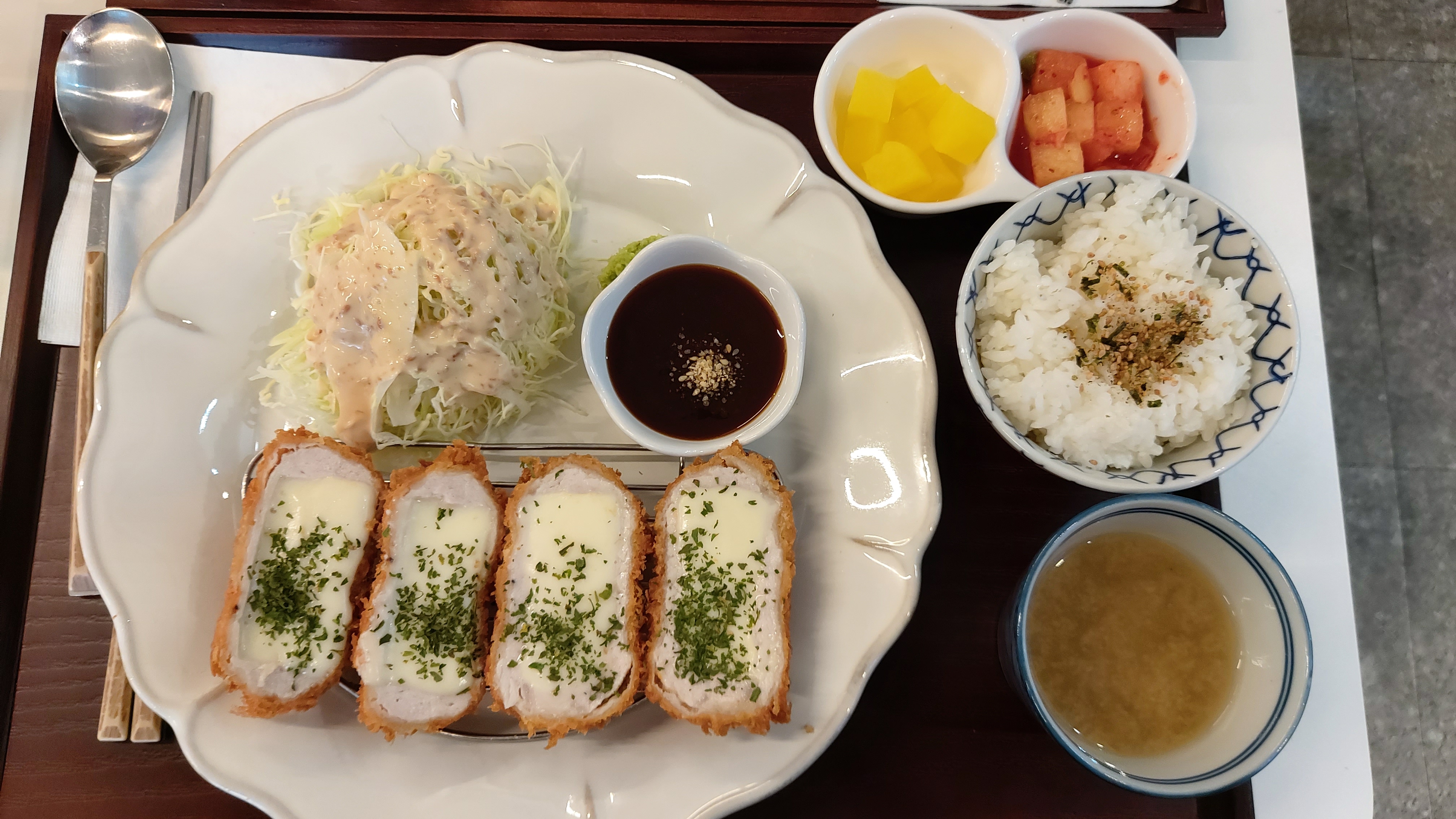 대표메뉴인 수작카츠 입니다. 등심카츠 한장과 모짜치즈카츠 한장이 함께 나옵니다. 밥과 미소된장도 나오지만, 무엇보다 샐러드 소스가 매우 괜찮습니다. 맛이 있어서 또 달라고 하게 되네요.