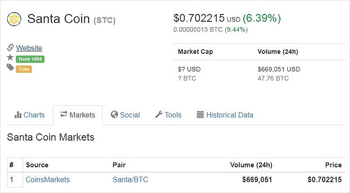 그렇게 잡생각을 하고 있는데, 전세계의 1300개가 넘는 코인중에 혹시 산타코인이 있지 않을까 하는 생각이 문득 들더군요. 그래서 바로 Coinmarketcap.com에서 검색을 해보았습니다. 이게 웬일인가요? 정말 Santa coin이 있네요.