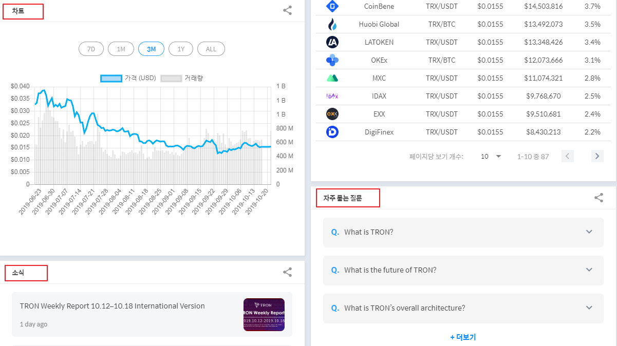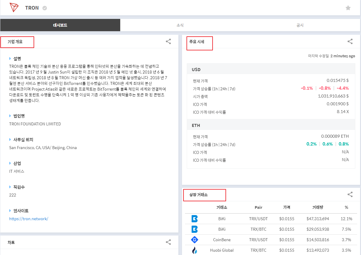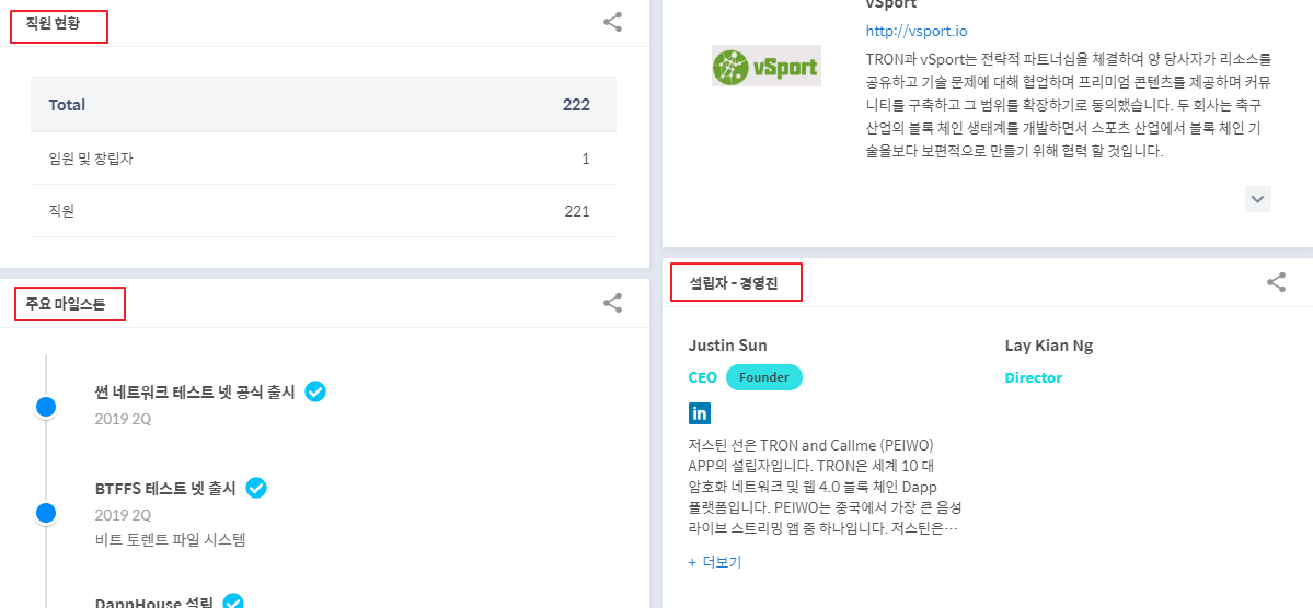 아래 화면은 프로젝트 리스트 중에서 14위내에 유일한 A등급으로 공시를 하고 있는 TRON의 정보를 캡쳐한 화면 입니다. TRON이 Justin Sun 때문에 말이 많기는 하지만, 공지를 투명하게 잘 하고 있는 모양 입니다. 트론을 통해 살펴보는 쟁글의 프로젝트별 제공 정보는 기업개요, 주요시세, 상장거래소, 차트, 자주묻는질문, 소식, 직원현황, 주요마일스톤, 설립자와 경영진 입니다.