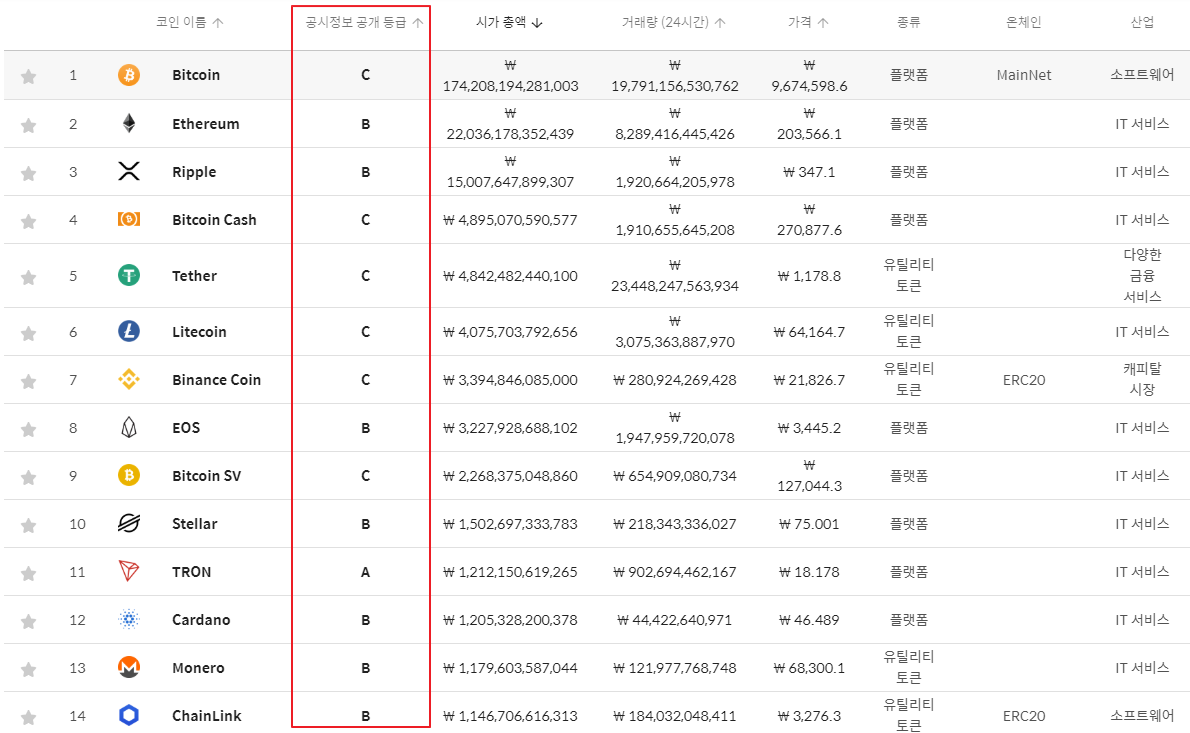 프로젝트 리스트에서는 코인이름, 시가총액, 거래량, 가격, 종류, 산업에 대한 정보를 소팅 또는 필터링해서 살펴볼 수 있습니다.