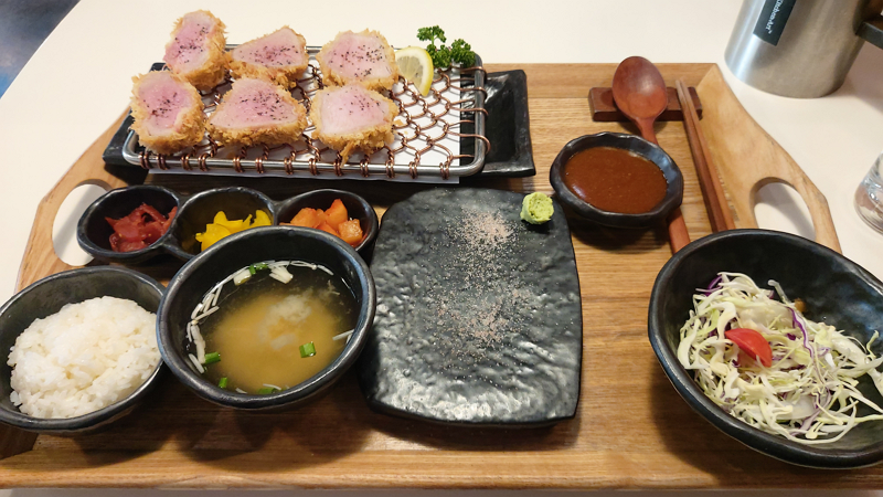 잠시 기다리고 나니, 한세트가 나왔습니다. 히레카츠 6조각에 밥, 미소된장, 샐러드, 돈카츠소스, 단무지, 깍두기외 반찬, 그리고, 넓적한 검은 돌판에 핑크솔트와 생고추냉이가 있습니다.