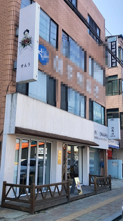 도로변 주차구역에 주차를 하고나서, 뒤로 돌아 걸어가니, 이제야 건물 상단에 만들어 놓은 간판이 보이더군요.