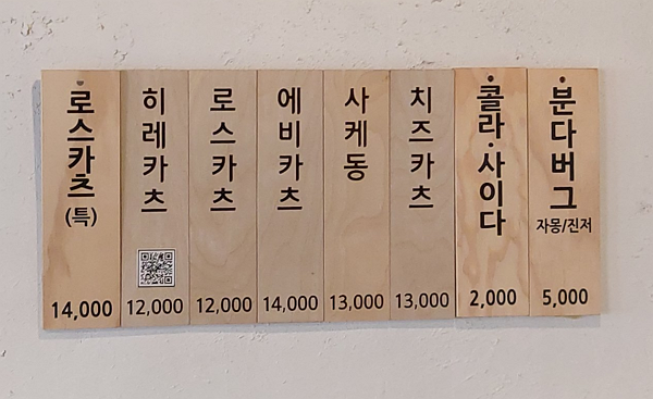 간판은 간단 합니다. 두가지 음료수와 히레카츠, 로스카츠, 에비카츠, 사케동, 치즈카즈, 로스카츠(특)이 있어요. 가장 인기메뉴가 어떤것인지 여쭈어 보니, 히레카츠라고 말씀을 하셔서, 바로 주문을 했습니다.