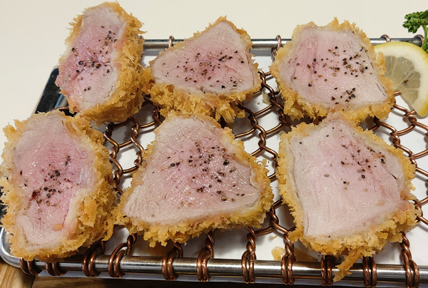 히레카츠만 가까이서 촬영을 해보았습니다. 분명히 돼지고기 안심으로 만든 히레카츠 인데, 약간 미디엄 느낌으로 구워져서 인지, 소고치를 먹는건가하는 착각에 빠졌습니다. 물론, 소고기로 만든 규카츠는 더 작기 때문에 헷갈린게 아니라, 약간 불그스름한 육질 때문에 헷갈렸습니다.