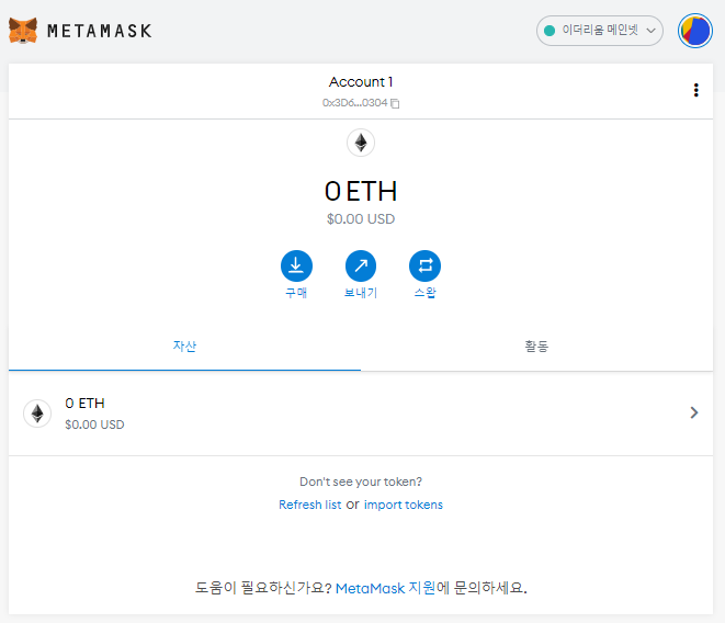 이제 여러분도 이더리움 메인넷에 이더리움 지갑을 갖게 되신 겁니다. 아래 사진을 보시면, Account1 이라고 쓰여진 곳 하단에, 이더리움 주소가 보이시죠? 이 지갑으로 이더리움을 받으시려면, 이 주소를 코인을 전송할 사람에게 주면 됩니다. 그리고 아랫쪽에는 0 ETH 가 보이시죠? 현재 지갑에 이더리움이 1개도 없다는 뜻 입니다.