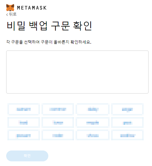 위 이미지에서 비밀 단어가 있는 자물쇠를 클릭하면, 12개의 단어가 표시되면, 출력 등을 하여 잘 보관한 후에 다음 버튼을 클릭합니다. 그러면, 아래오 같이 비밀 백업 구문을 확인하라고 나오는데, 앞에서 본 단어의 순서대로 단어를 클릭하면, 차례대로 배열이 됩니다. 배열후 확인 버튼을 클릭 하면, 지갑의 주인임이 확인되는 것입니다.